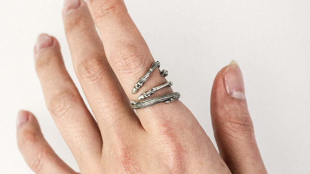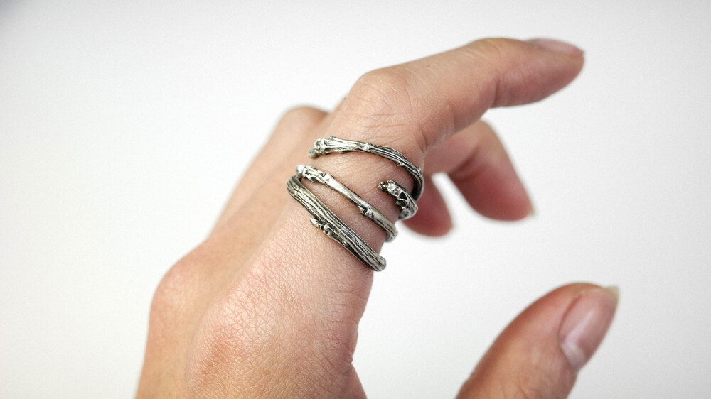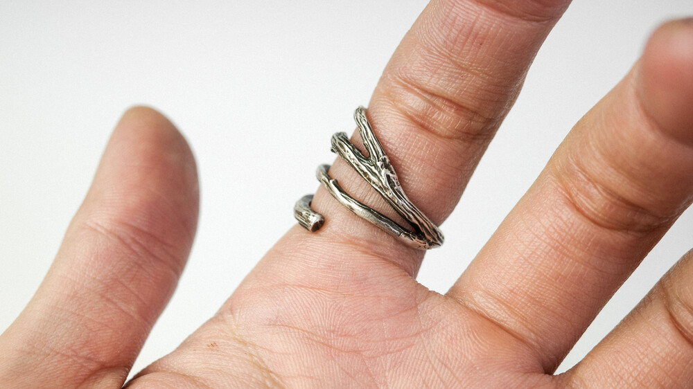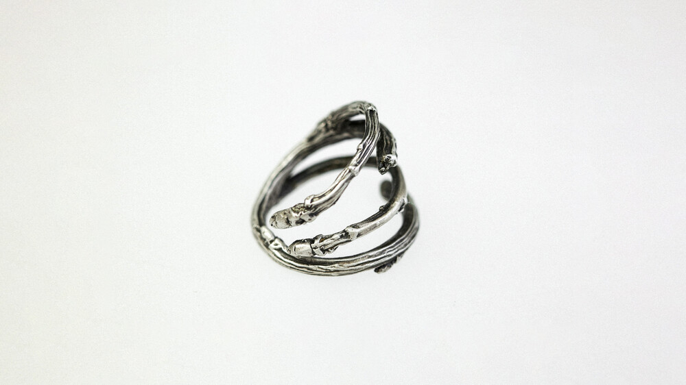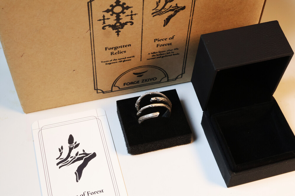 숲의 조각은 겨우내 새순을 움틔우려다 피워내지 못하고 말라간 실제 나무의 파편을 가져와 은으로 녹여낸 반지입니다. 비록 숲이 되지는 못했지만 그 조각은 은이 되어 우리의 손에서 살아갈 거라고 생각합니다.