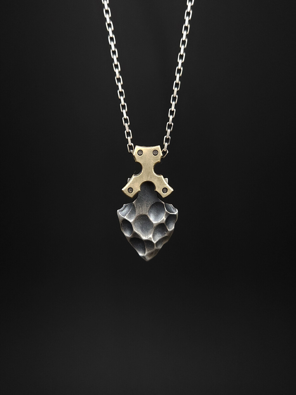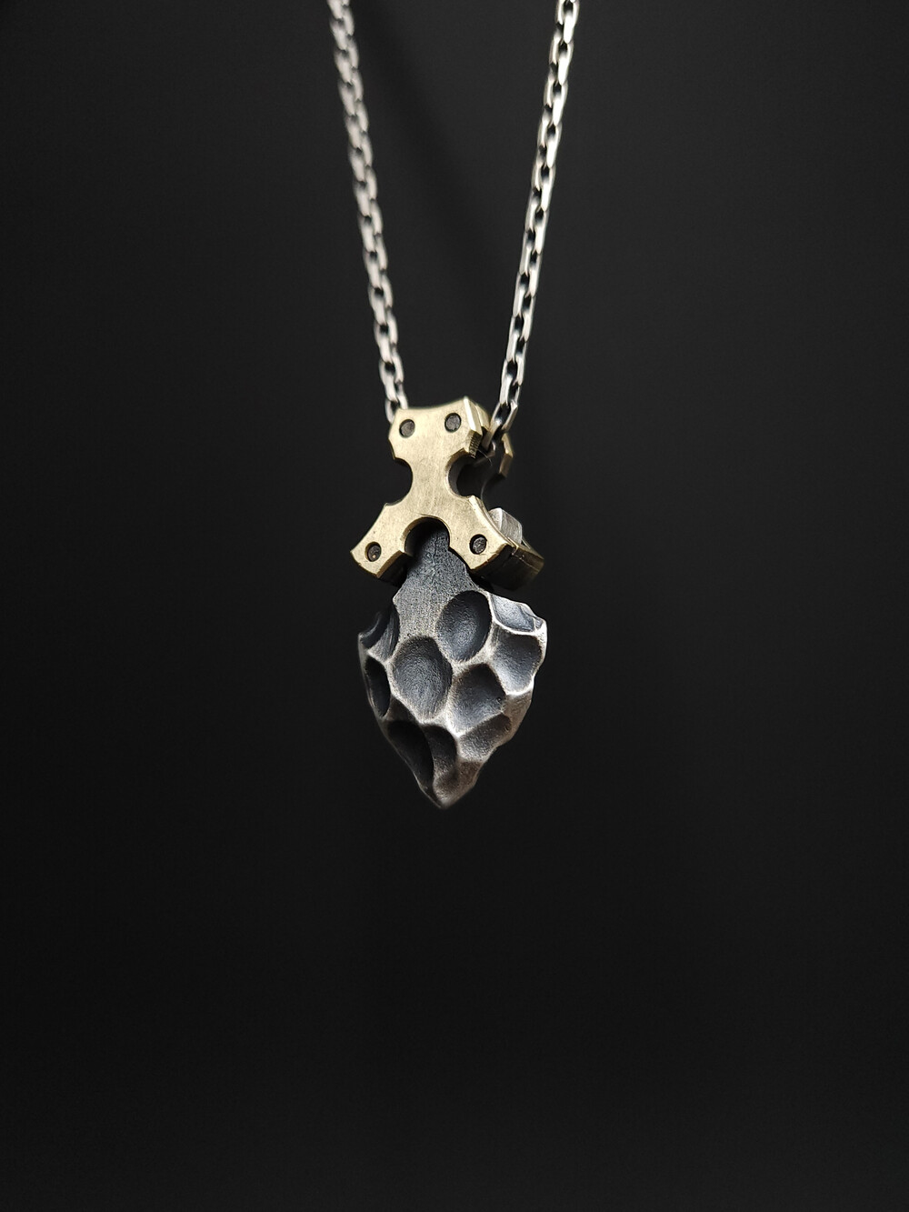 요석 파편 펜던트는 요석 머리부 펜던트와 함께 요석 시리즈로 출시된 제품입니다. 은으로 주조하고 흑착색을 한 후 빛을 받는 부분만 벗겨낸 뒤 황동으로 디자인한 연결부에 자연스레 맞물리게 만든 작품입니다. 또한 제품 메인이미지에서 보시다시피 일반적인 타입과 연결부가 없는 심플한 타입이 있으니 선택해서 구매해 주시면 감사드리겠습니다.