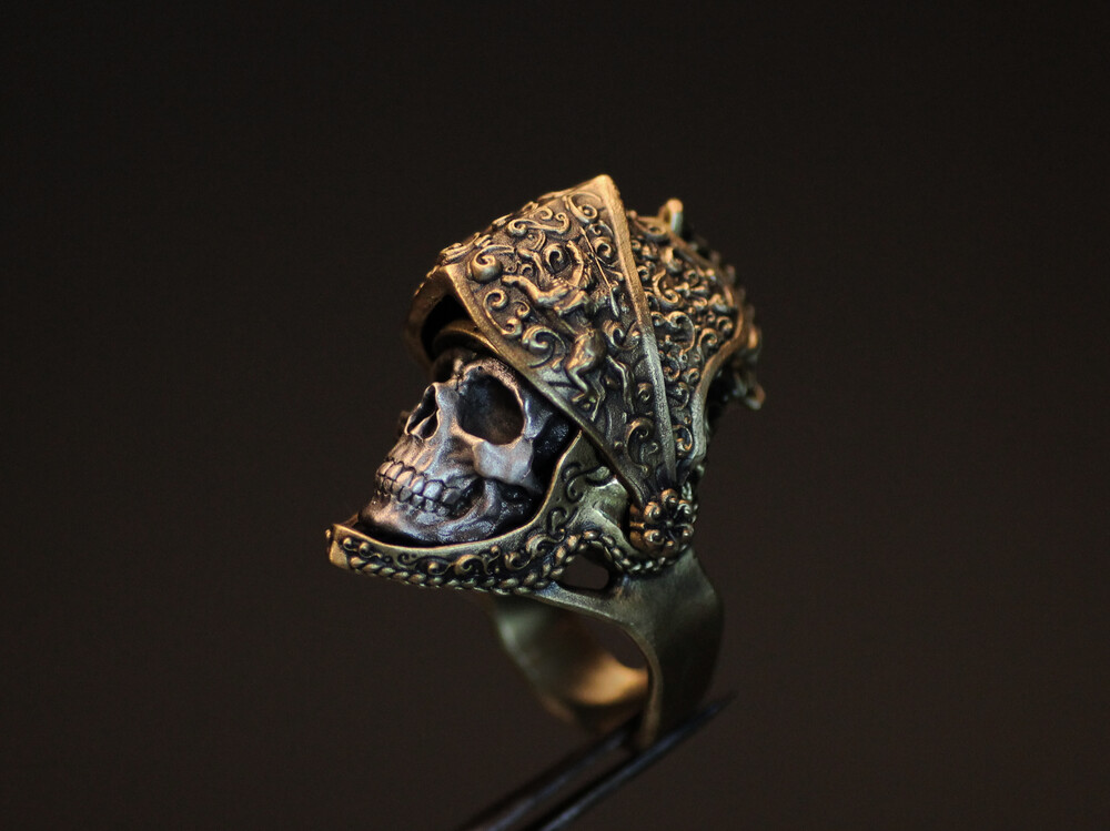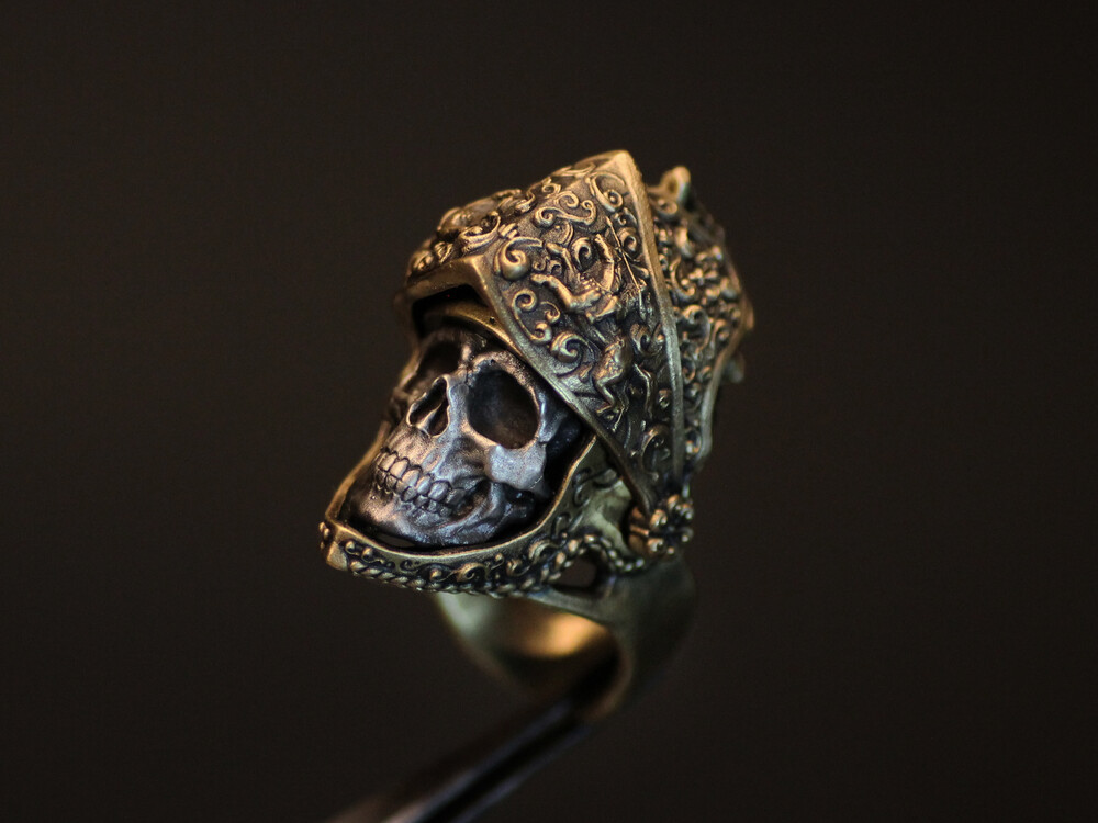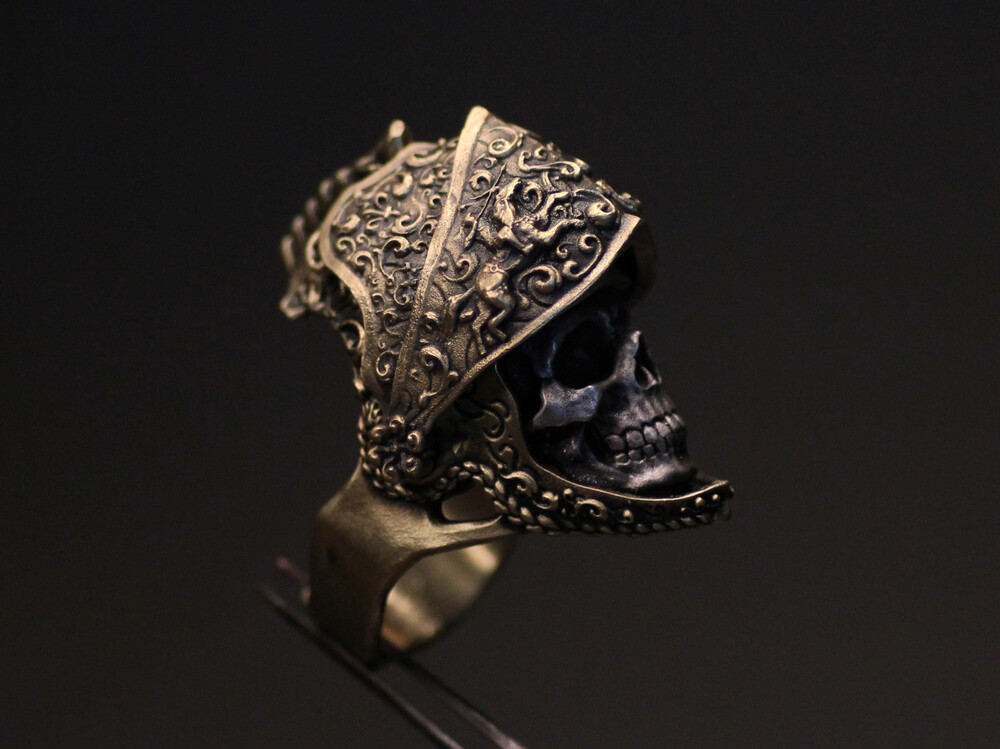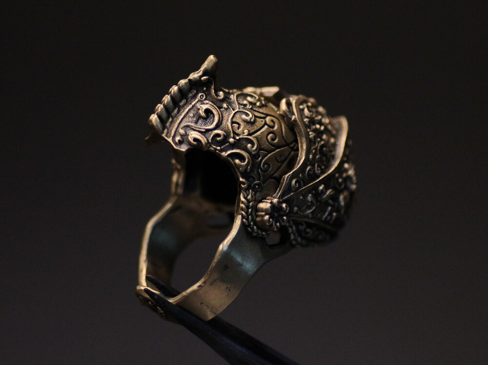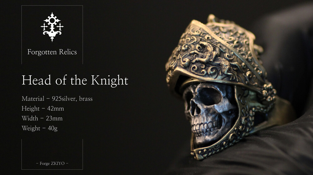 '기사의 목' 반지타입은 작가가 황동 덩어리를 주조하여 근위대의 의장용 투구를 만들고 은으로 안면부를 깎아 결합한 목걸이입니다. 근위대의 양식은 16세기 그리니치 양식의 갑옷들과 15세기 말 퀴레시어 기병들을 참고하였으며 앞 면갑부는 위아래로 움직일 수 있게, 또한 끝까지 올리면 요철로 잠겨져 고정되게 디자인하였습니다.