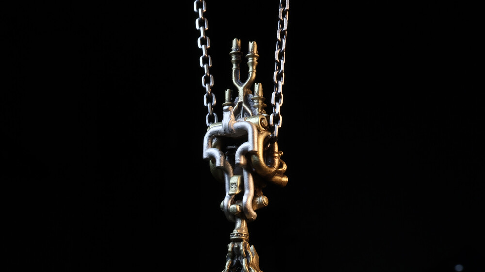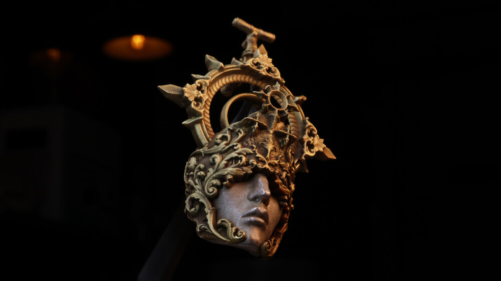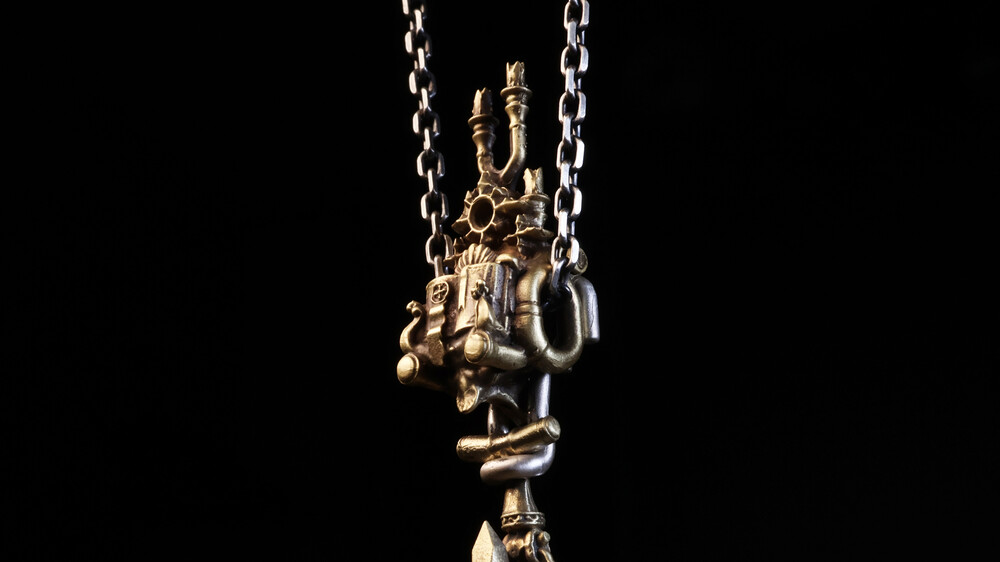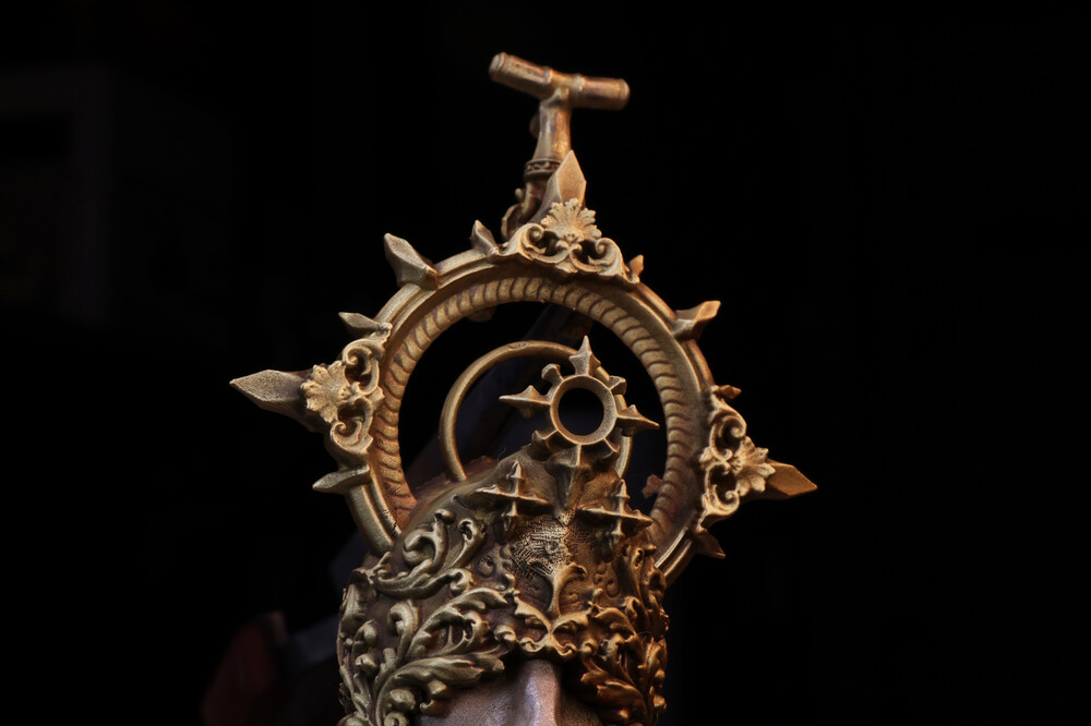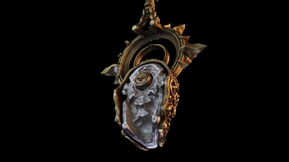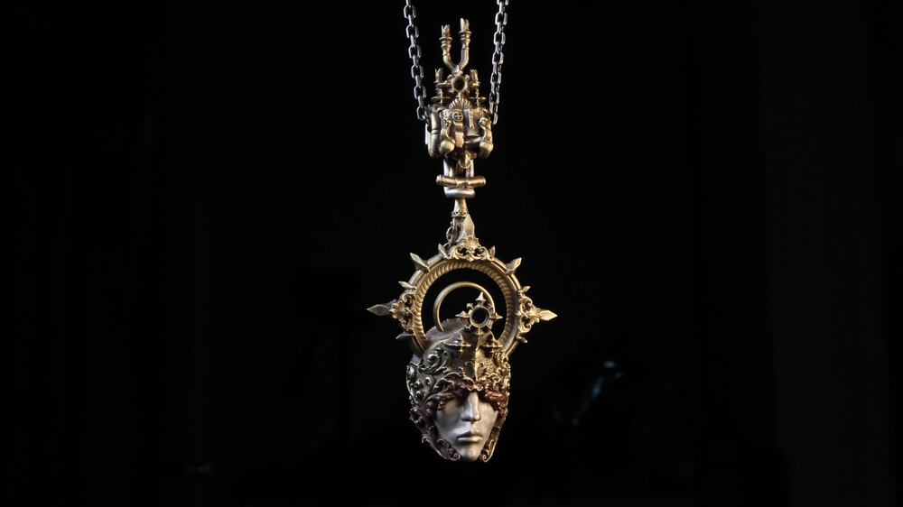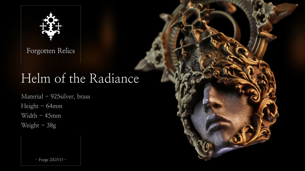'광휘의 면갑' 유물은 묵직하게 은으로 세공한 기사단장의 얼굴에 황동으로 깎은 교단의 태양 상징 면갑을 세팅해 넣은 주얼리입니다. 설정상 이들은 세례식 중에 보여진 태양빛 광휘의 형상을 주조하여 머리에 쓰고 다니며 이를 통해 그들이 가는 길에 빛의 축복이 따르리라고 생각하는 사람들입니다. 이야기와 주얼리를 부디 같이 즐기실 수 있으면 좋겠습니다.
