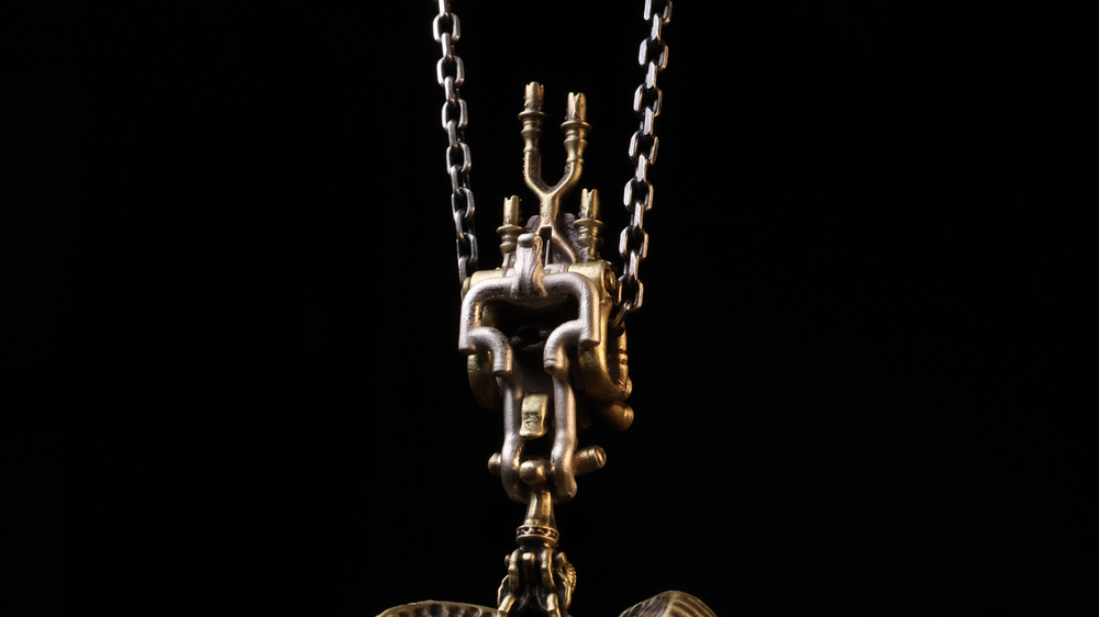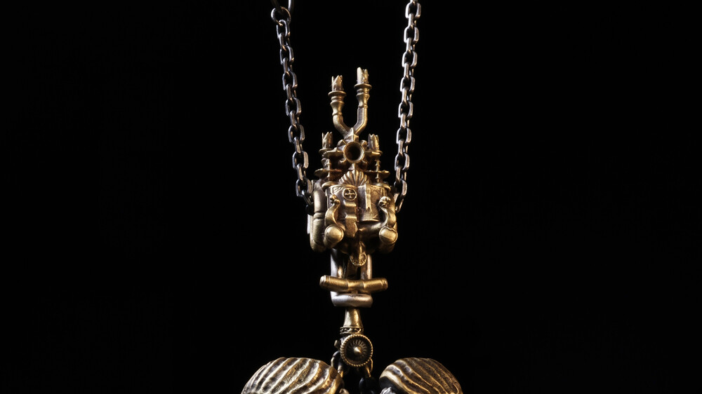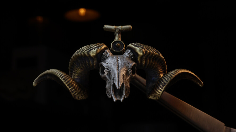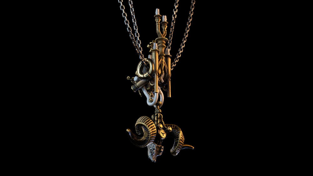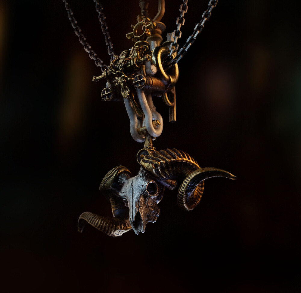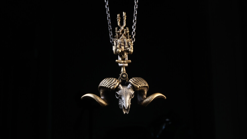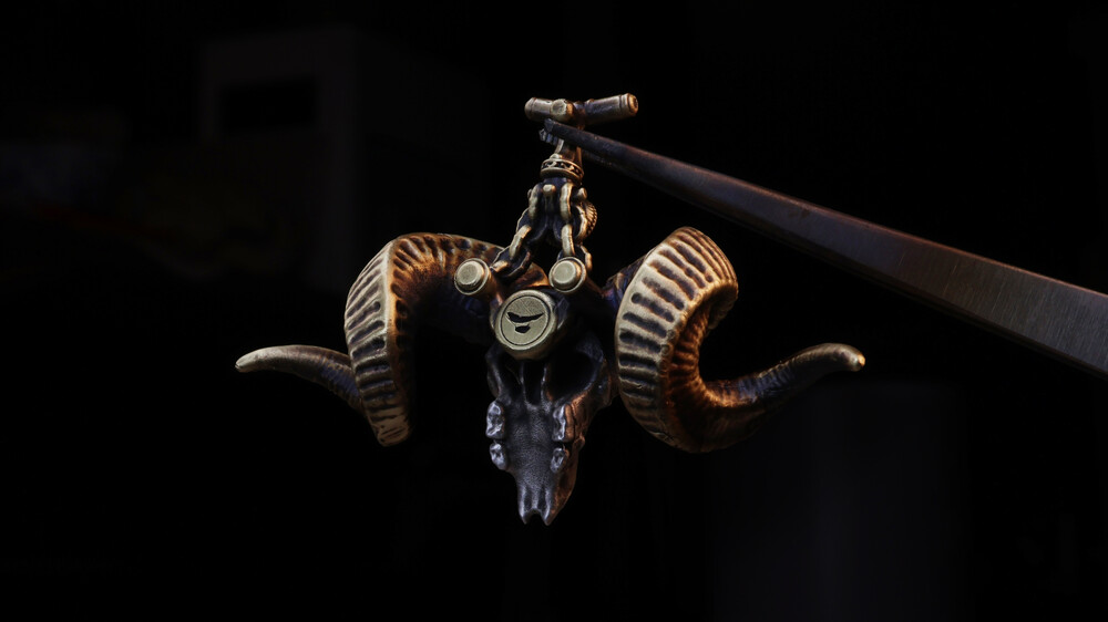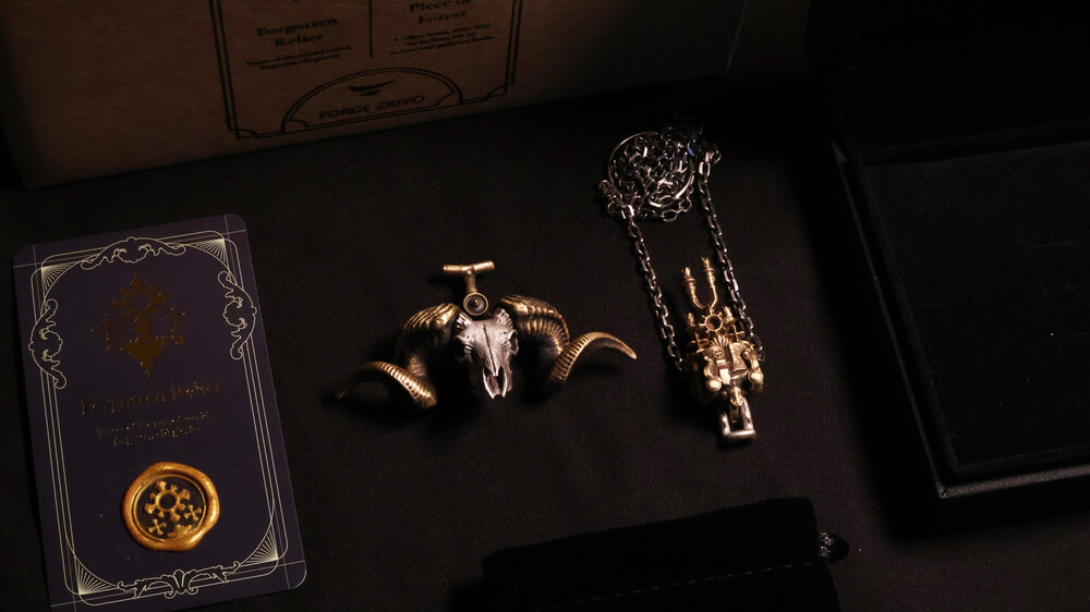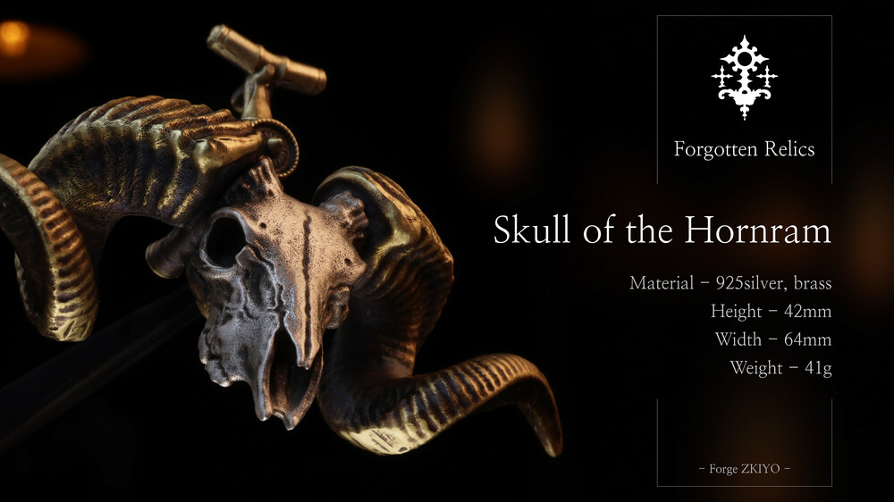 '뿔양의 머리뼈' 유물은 묵직하게 은으로 세공한 뿔양의 머리에 황동으로 깎은 양의 뿔을 세팅해 넣은 주얼리입니다. 설정상 단단하기로 유명한 에이레흐 뿔양의 머리뼈를 목걸이로 표현하였으며 굵고 휘어진 뿔에서 그 강인함을 느끼실 수 있습니다.