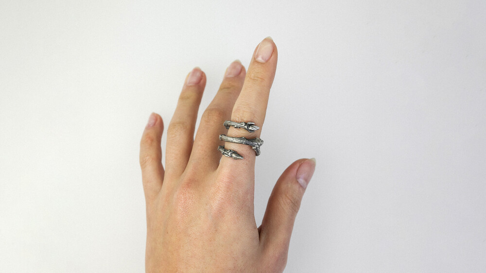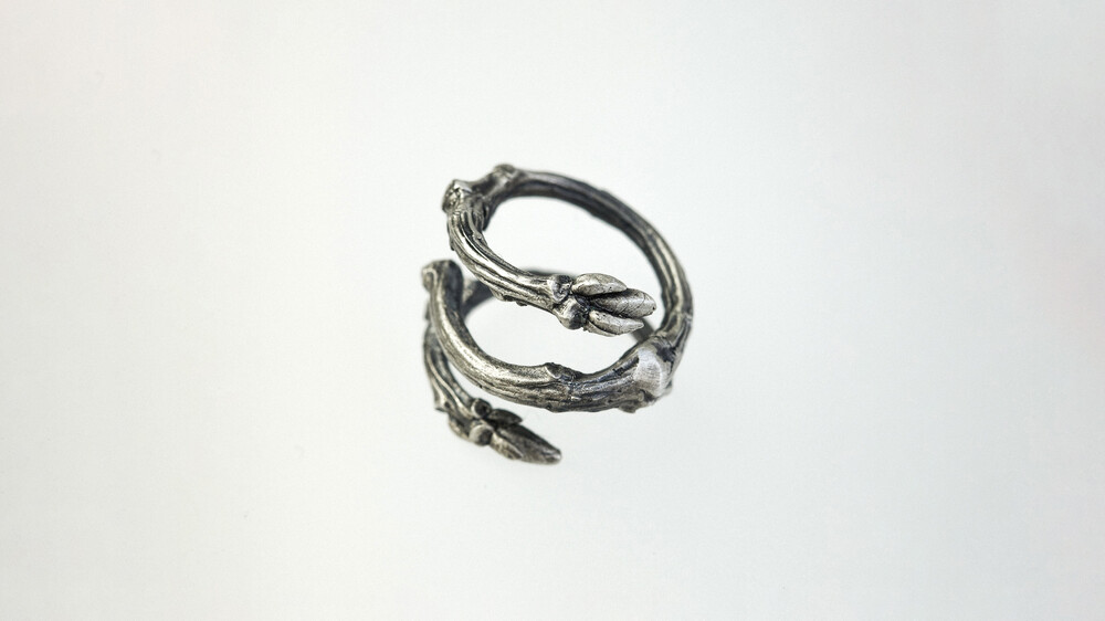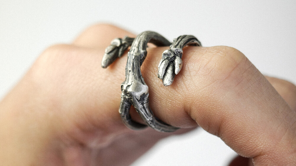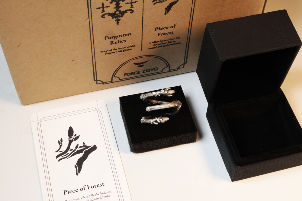 숲의 조각은 겨우내 새순을 움틔우려다 피워내지 못하고 말라간 실제 나무의 파편을 가져와 은으로 녹여낸 반지입니다. 비록 숲이 되지는 못했지만 그 조각은 은이 되어 우리의 손에서 살아갈 거라고 생각합니다.